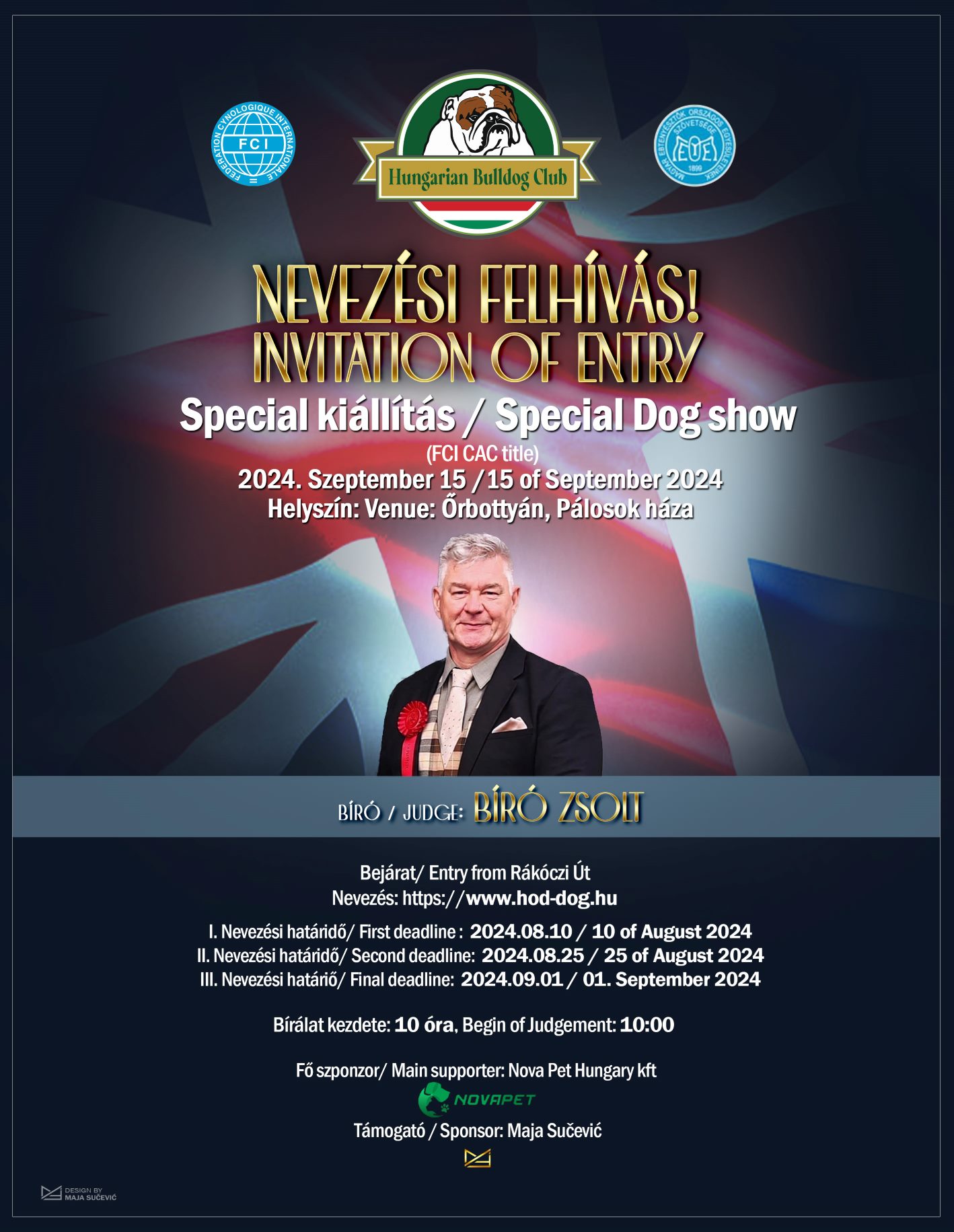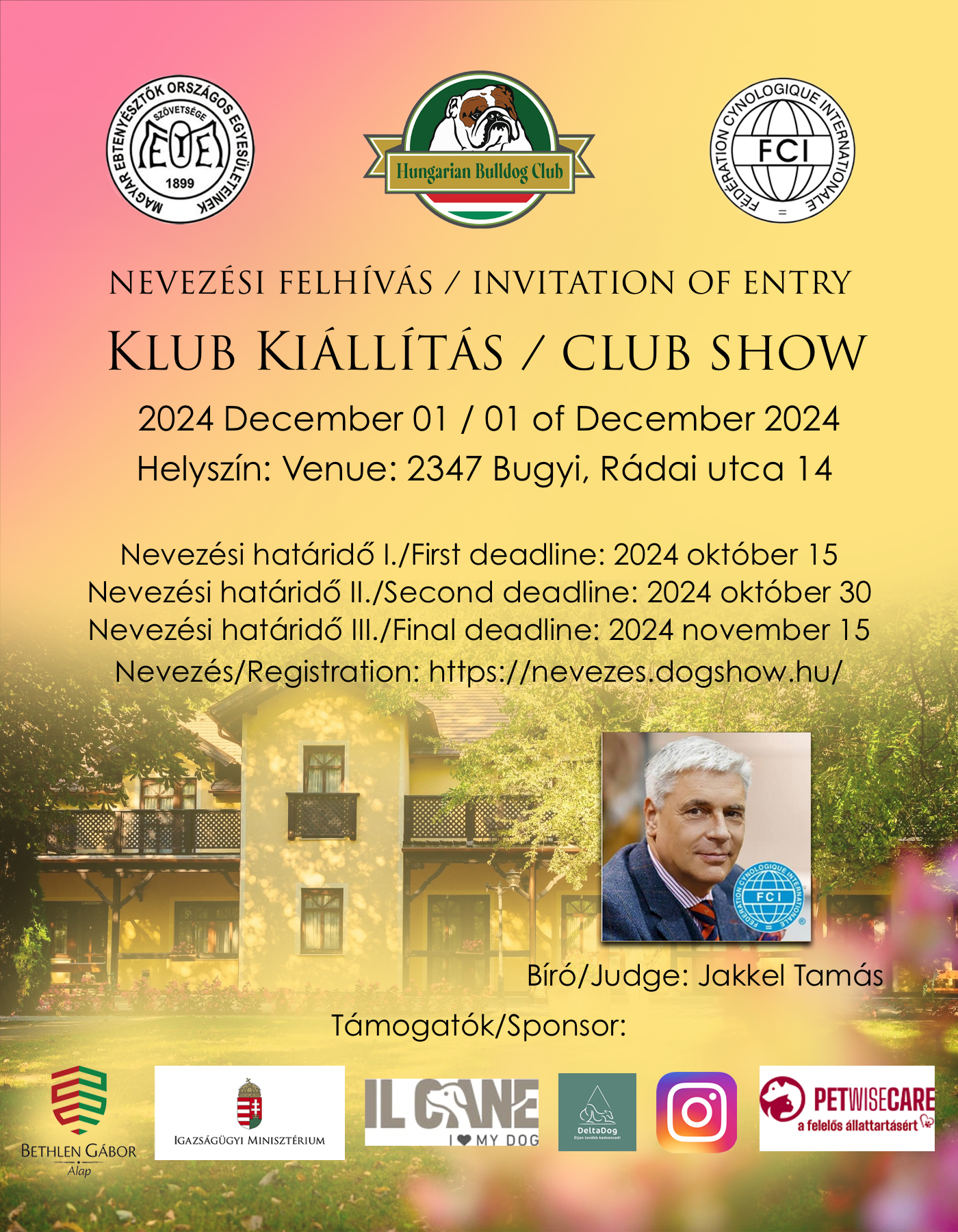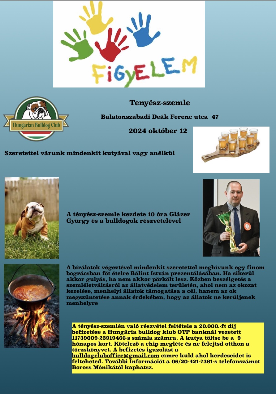 Szeretettel várunk mindenkit akár kutyával akár kutya nélkül jön. A tenyészszemle mellett egy jó borgácsozásra, beszélgetésre.  A tényész-szemlén való részvétel feltétele a 20.000.-ft díj befizetése a Hungária bulldog klub OTP banknál vezetett 11739009-23919466-s számla számra. A kutya töltse be a  9...
